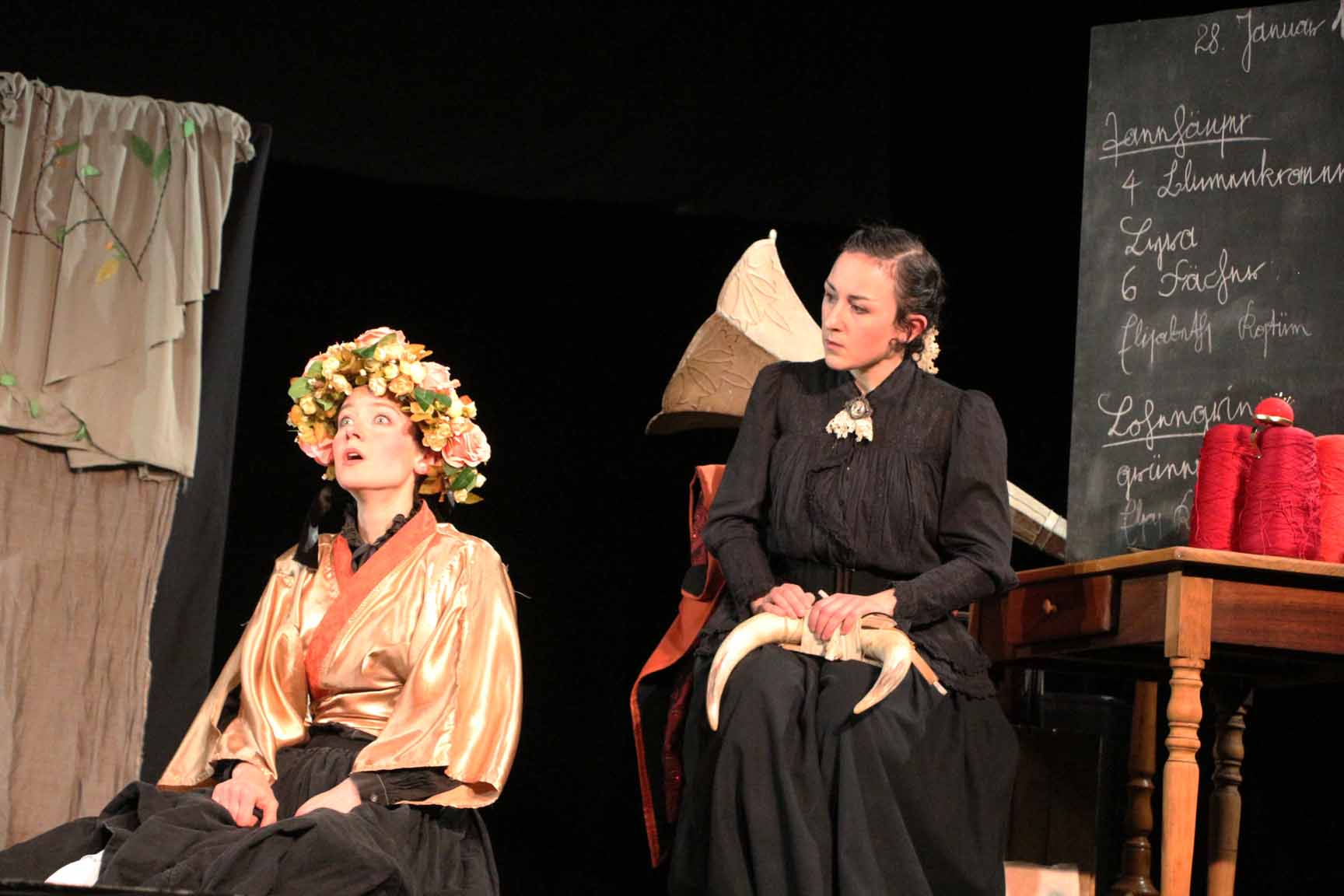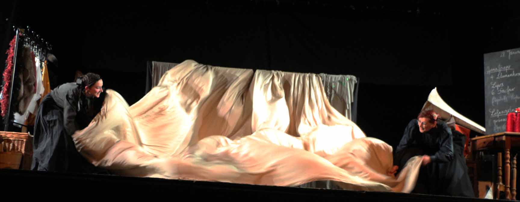 Il y a Léna, la vieille alsacienne qui travaille dans cet atelier depuis plus de quarante ans ; Madame Odile, la cheffe, férue d’opéra et Anna, la jeune allemande qui rêve de devenir danseuse. Elle a, sans en avoir conscience, l’arrogance des vainqueurs et la cruauté de la jeunesse : ce sont autant de couleuvres que la vieille Léna a bien du mal à avaler. Car nous sommes en 1873, deux ans à peine après l’annexion de l’Alsace au IIéme Reich allemand : les souffrances de la guerre et l’humiliation des vaincus sont des plaies encore vives gravées dans les cœurs. Alors, lorsque la colère ou le chagrin débordent, elles empoignent ce qu’elles ont sous la main, des costumes ou des marionnettes, et incarnent les Princesses et les Héros de la mythologie grecque, ces personnages légendaires dont la métamorphose tragique leur sert à la fois d’exutoire et de consolation.