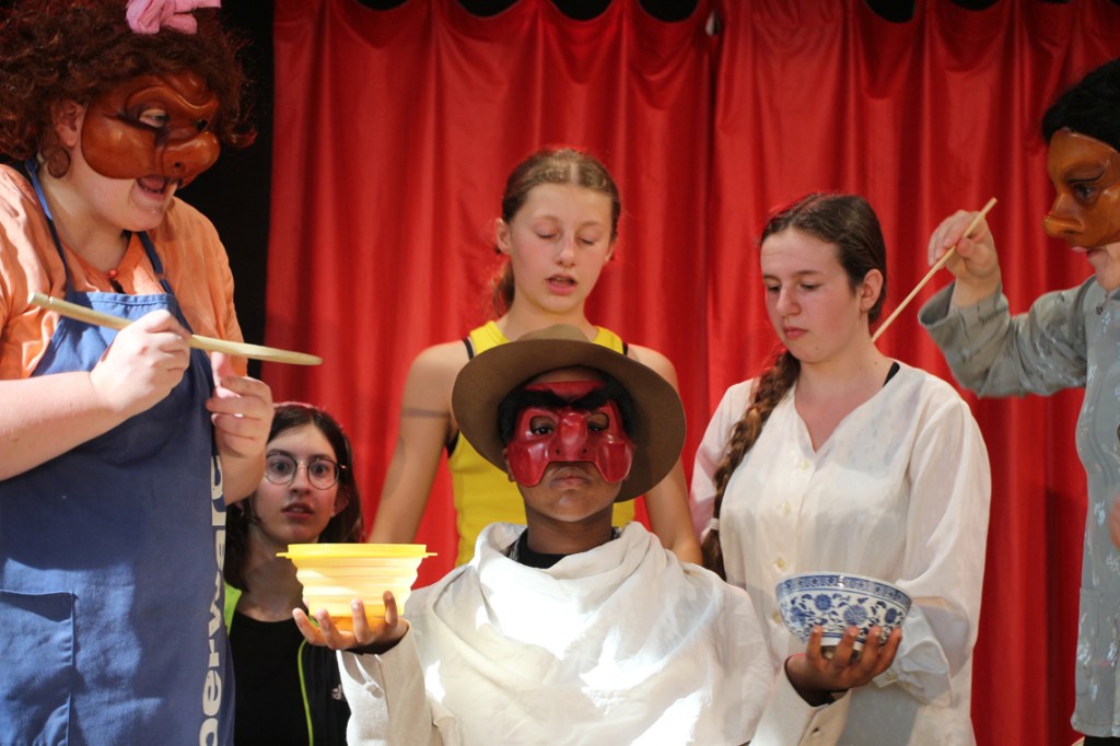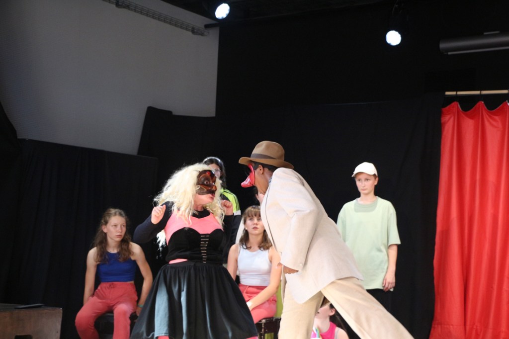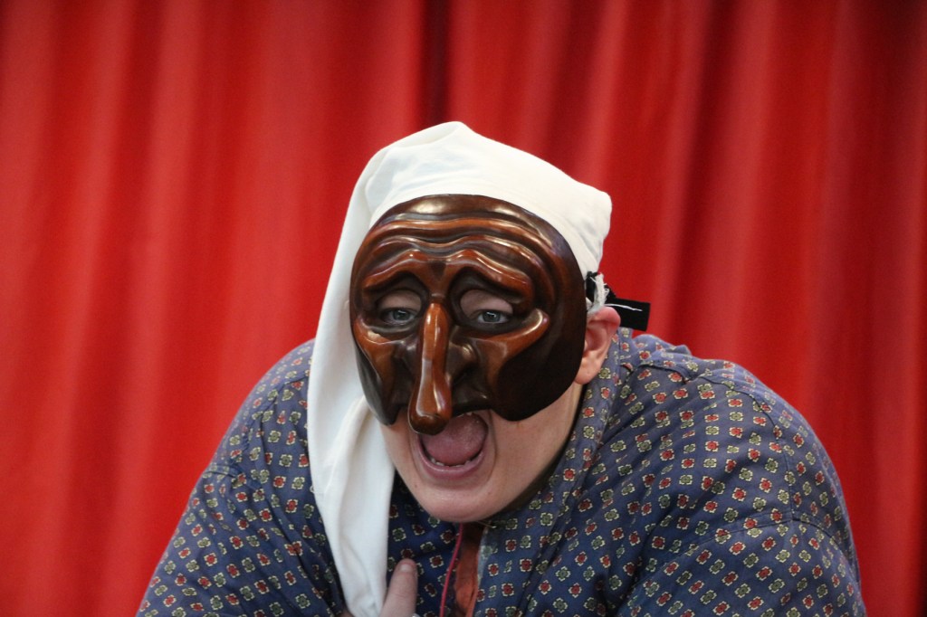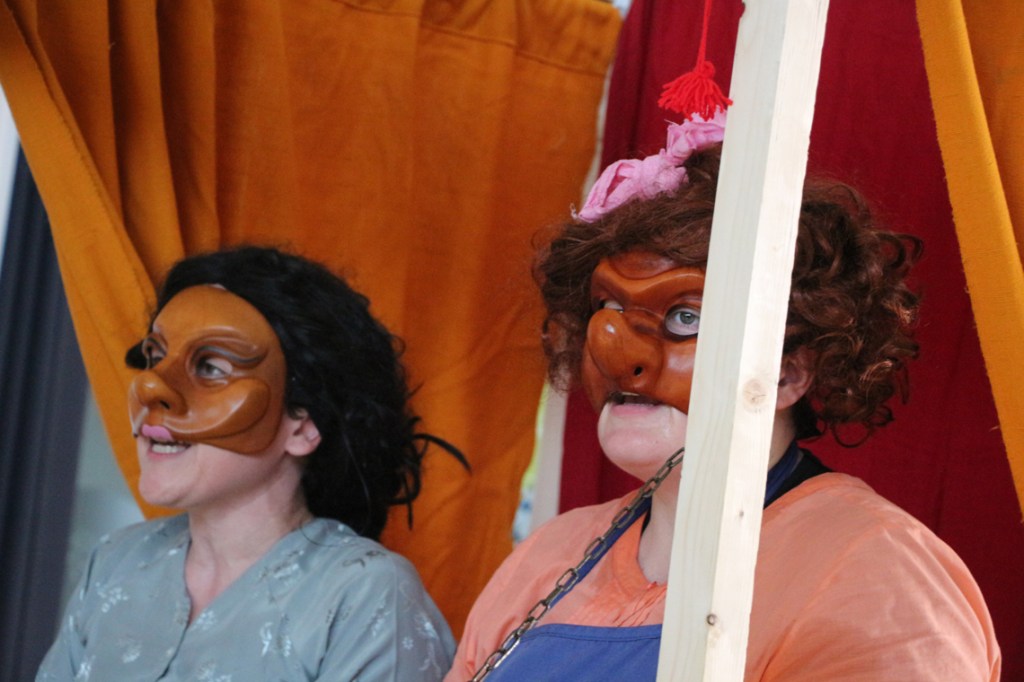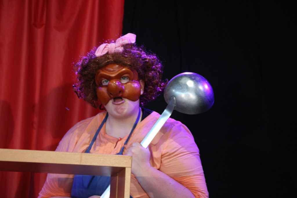 Cette fable nous ramène dans un temps historique que nous connaissons bien : Jeux vidéo et portables, Tupperware et rollers, Britney Spears et McDo… Mais interprétée par les personnages masqués de la Commedia Dell’Arte, la fable devient comédie. Une troupe de jeunes premières et de jeunes premiers nous entraîne dans une farandole endiablée, balayant les peurs et les rancœurs des adultes, dans un éclat de rire salutaire.