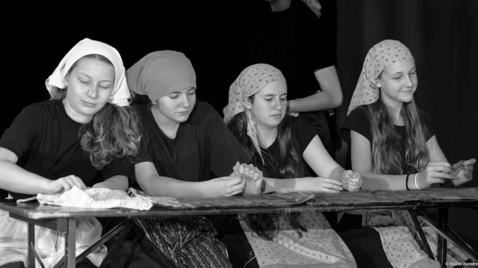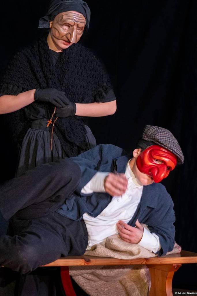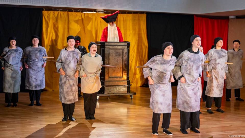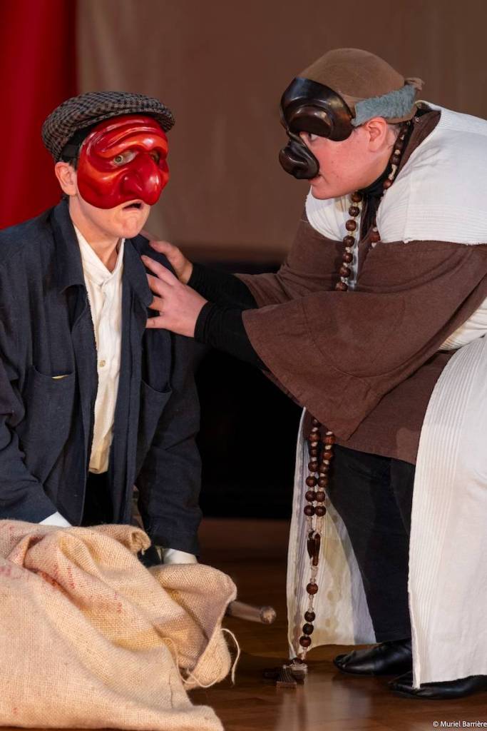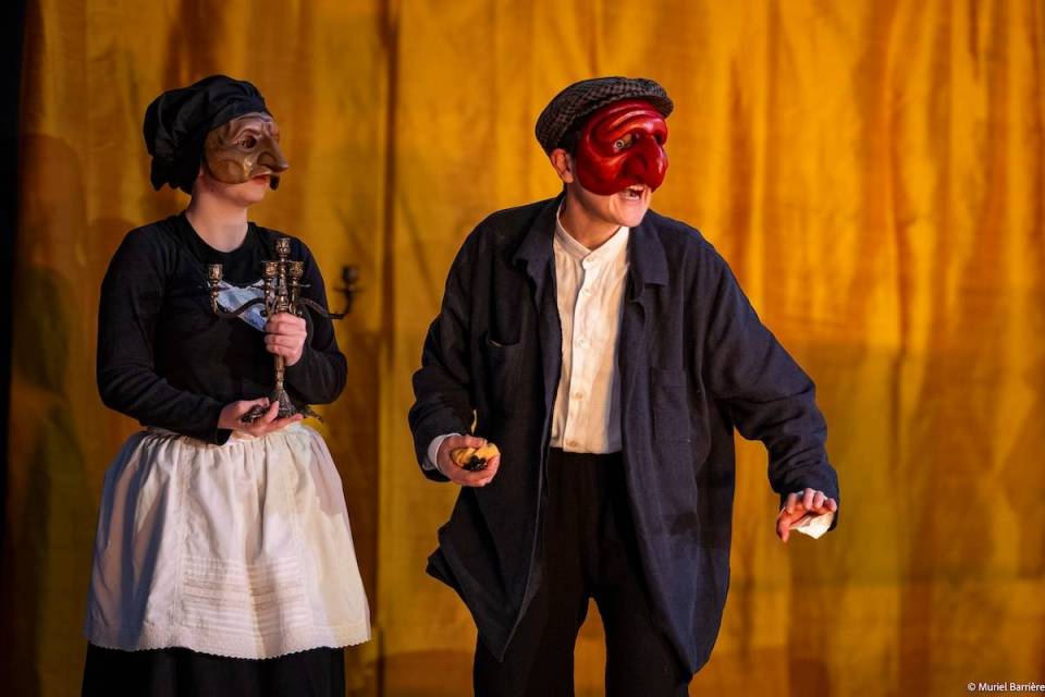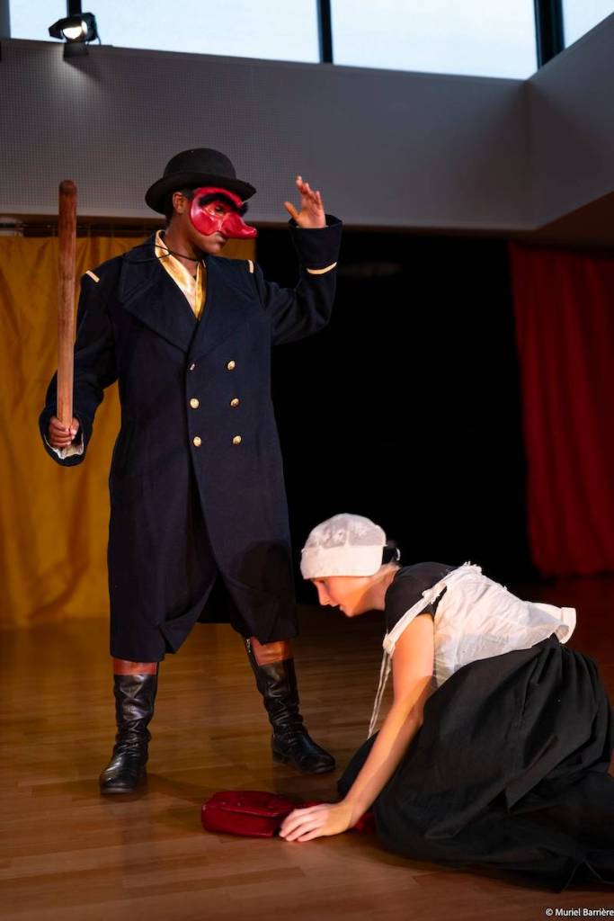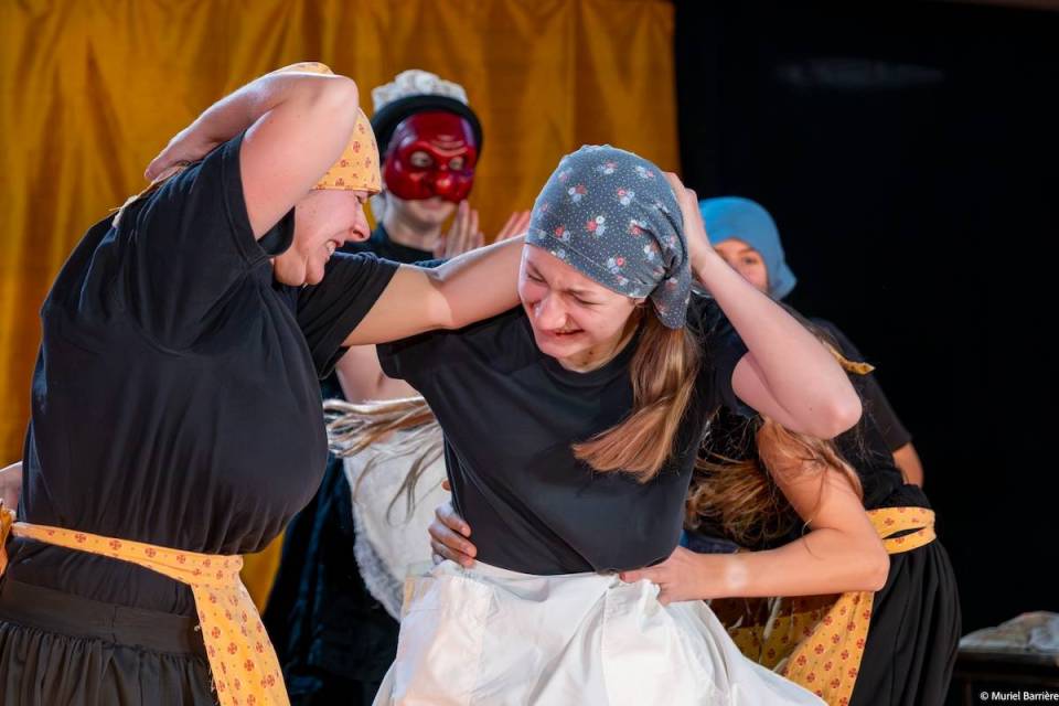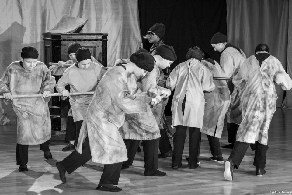 Les 14 comédiens de la troupe intergénérationnelle du THENSO incarnent plus de trente personnages, tantôt en chœur (les bagnards, les ouvrières) tantôt avec des masques de commedia dell’Arte, pour créer un spectacle à la fois burlesque et grave, poétique et émouvant, populaire et vivant.