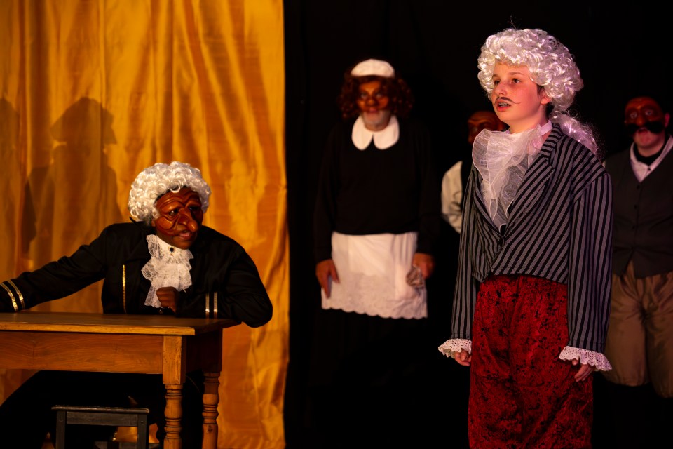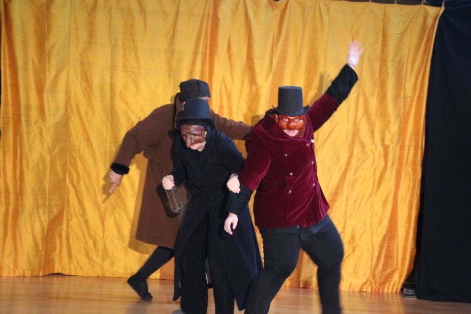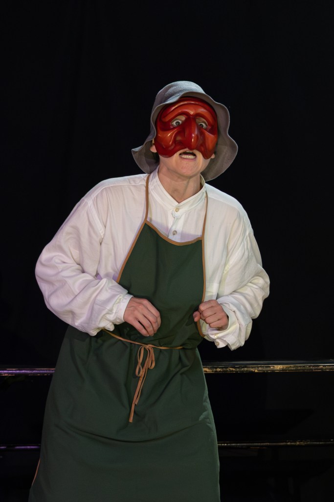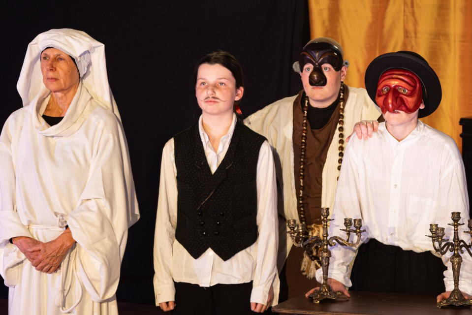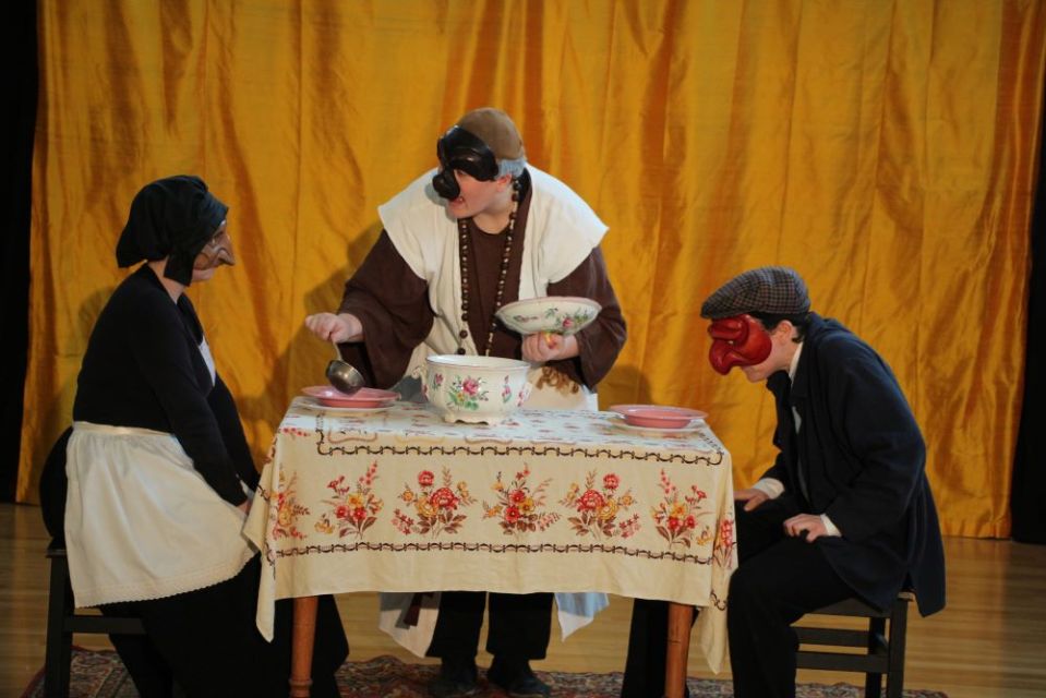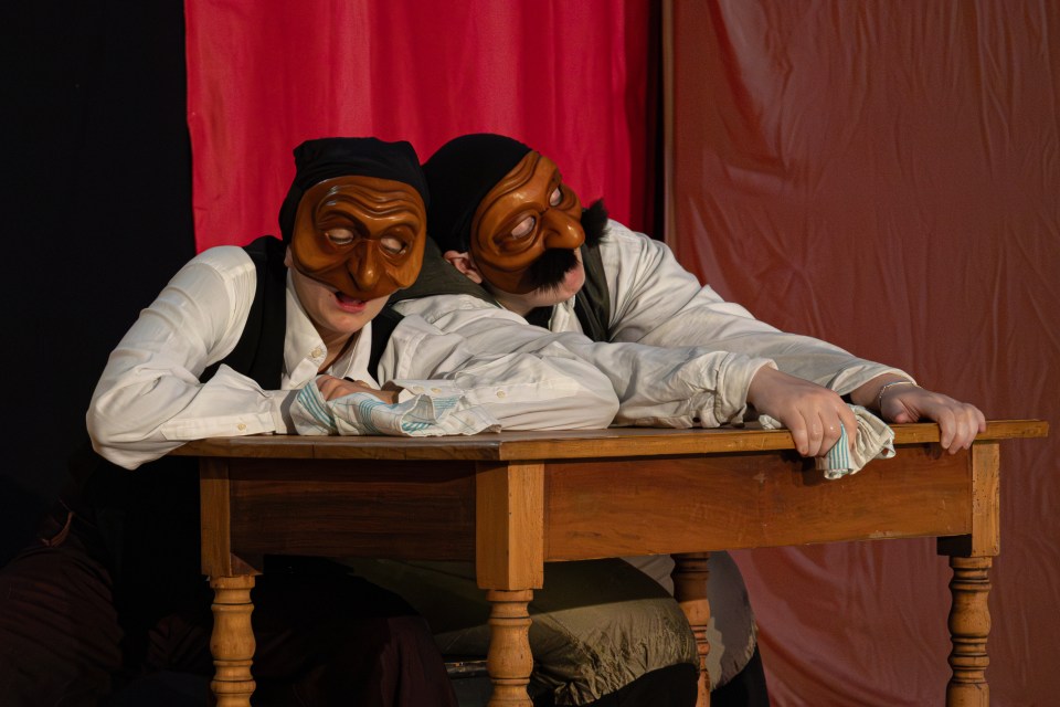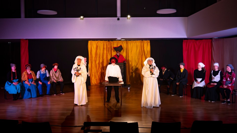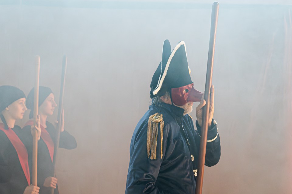 Les 14 comédiens de la troupe intergénérationnelle du THENSO incarnent plus de trente personnages, tantôt en chœur (les bagnards, les ouvrières) tantôt avec des masques de commedia dell’Arte, pour créer un spectacle à la fois burlesque et grave, poétique et émouvant, populaire et vivant.